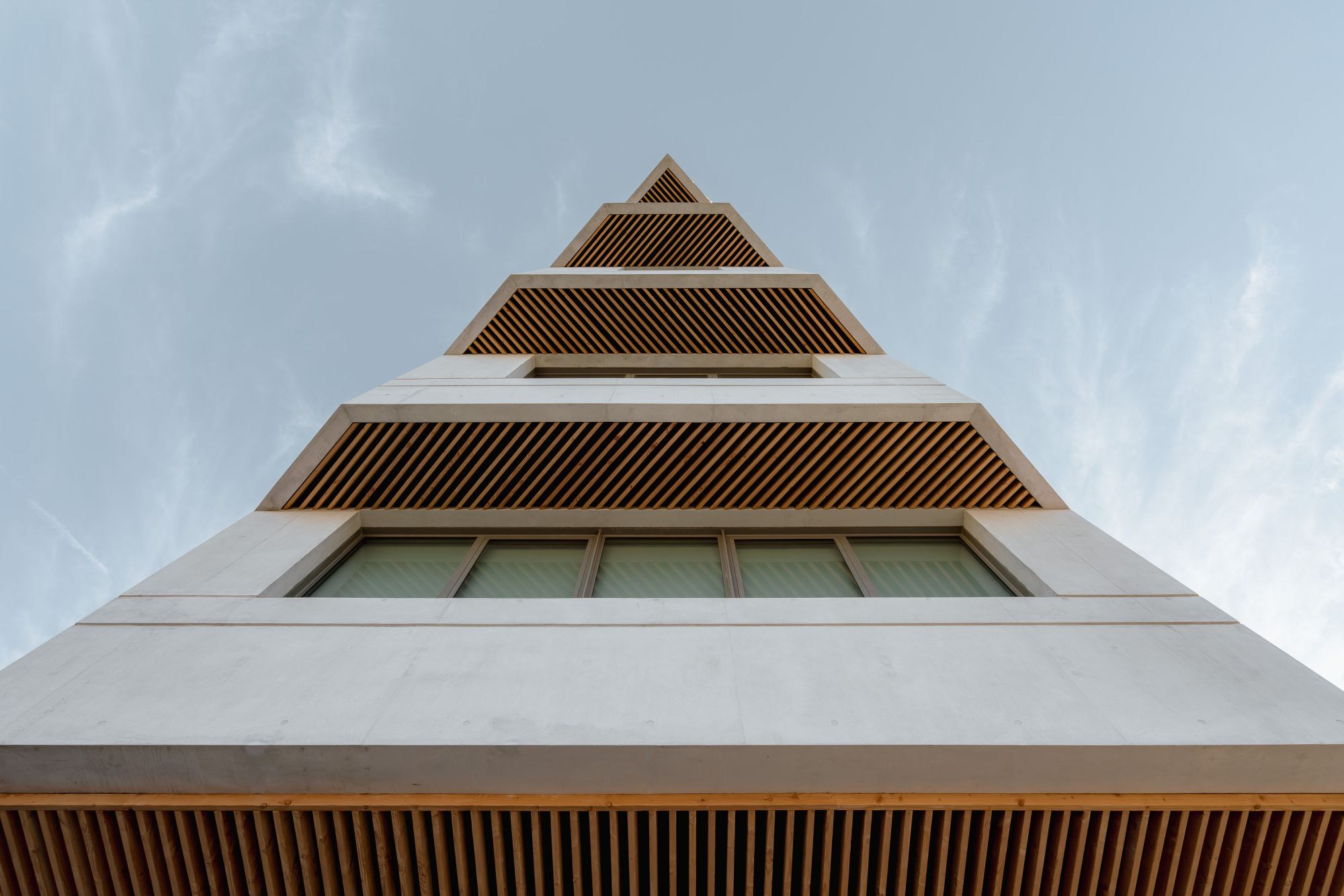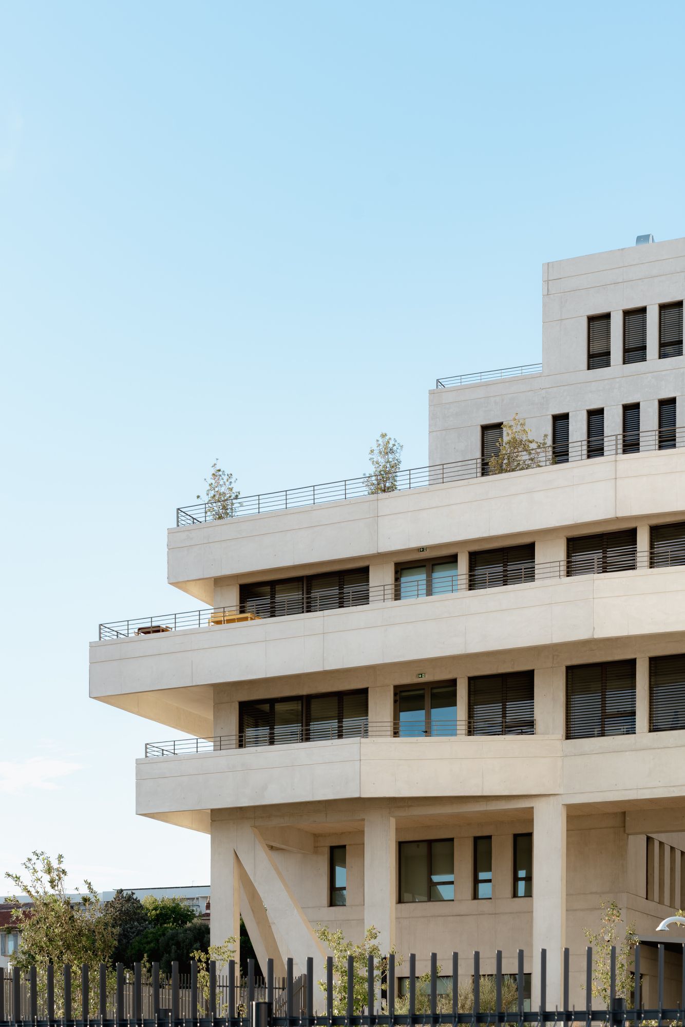Le bâtiment s’élève sur huit niveaux et vient former un premier versant culminant à 30 mètres et préservant ainsi le cœur de l’îlot de l’épuisant souffle du mistral.
