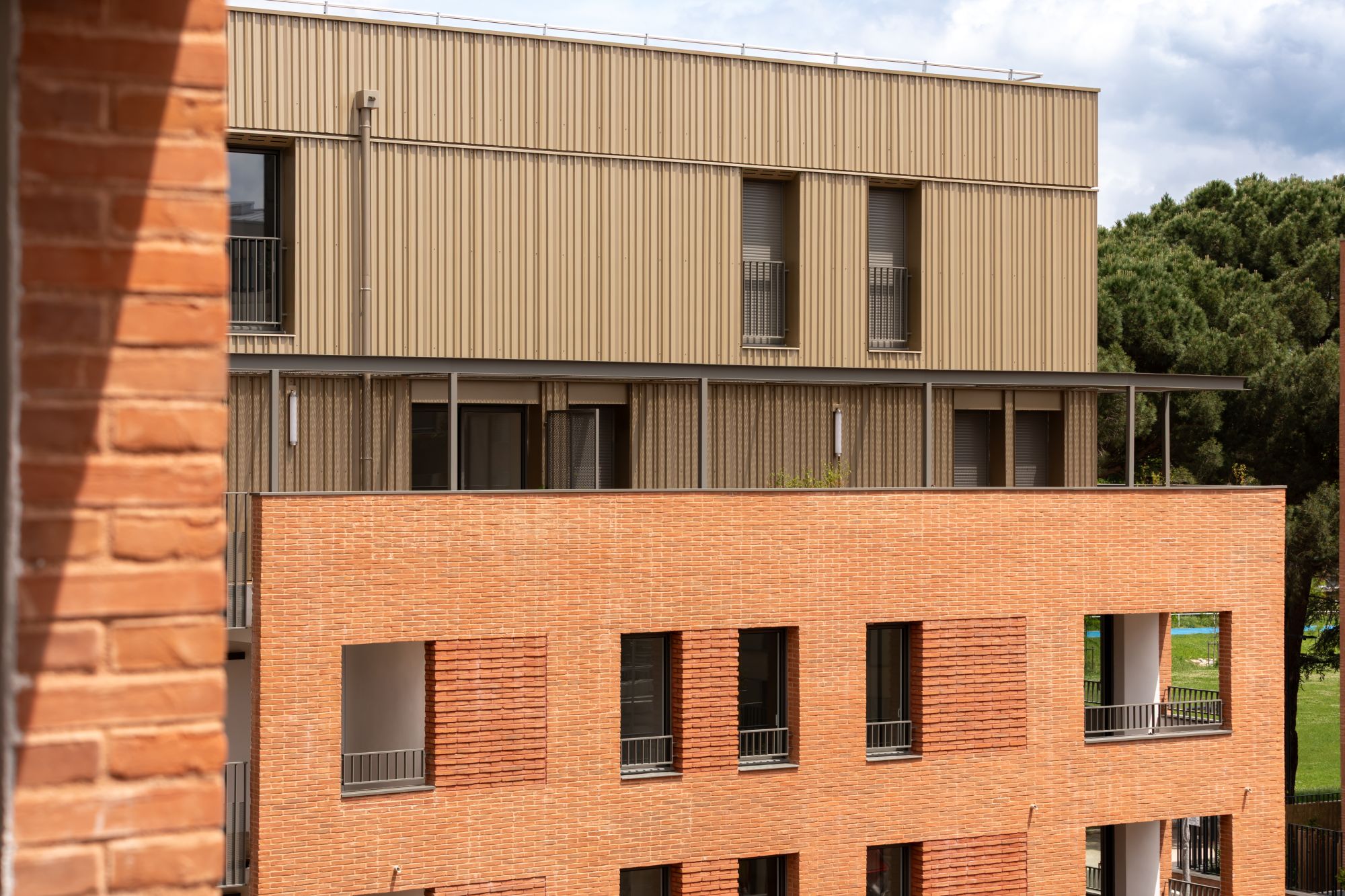 Chaque logement bénéficie d’espaces extérieurs généreux. Le socle dont la massivité est exprimée par la brique trouve