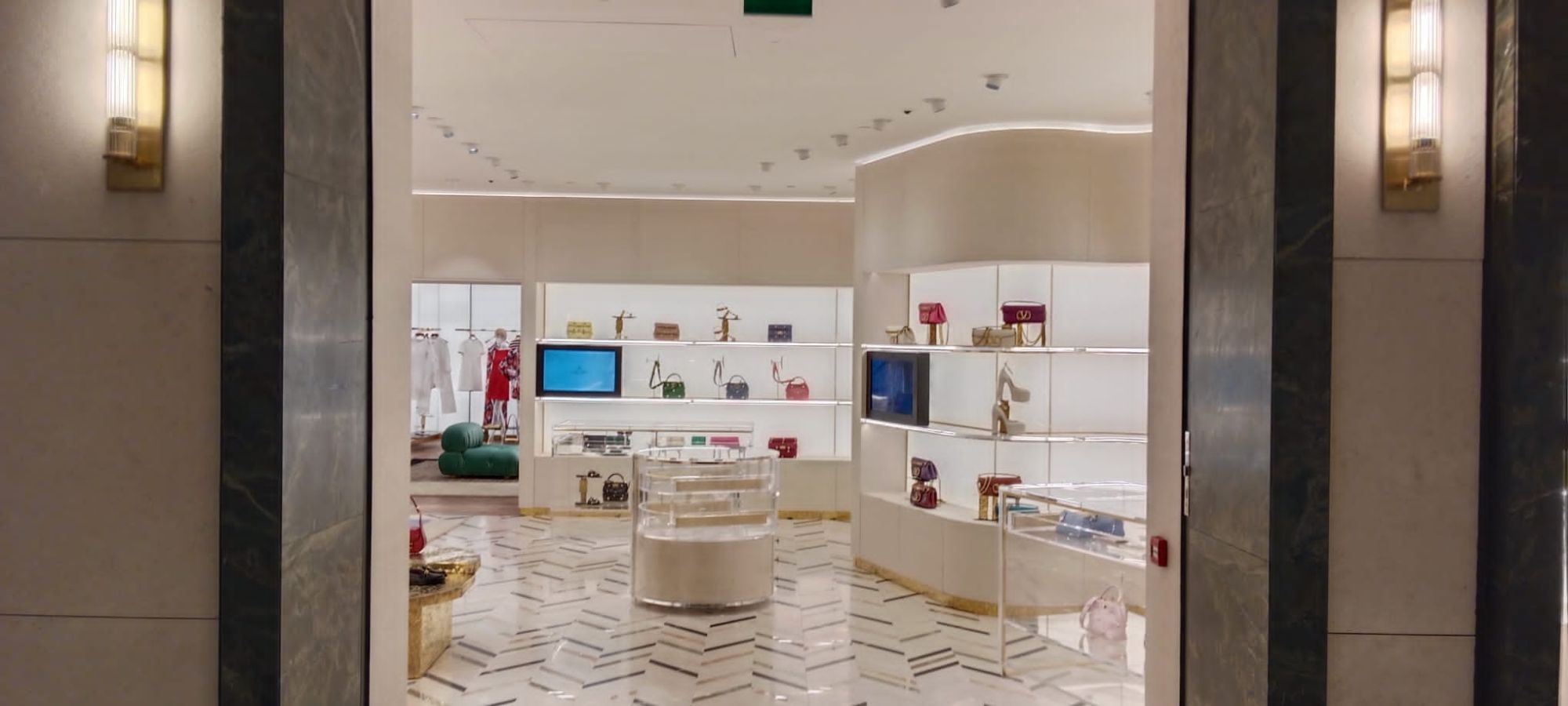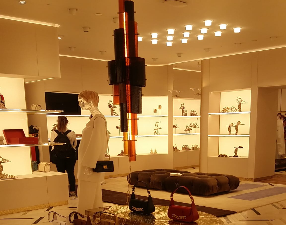 L’espace intérieur a été conçu pour refléter l’identité de Valentino, mêlant élégance contemporaine, sophistication et forte dimension créative. La sélection de matériaux nobles, des finitions haut de gamme et une palette chromatique raffinée composent un environnement qui sublime l’expérience sensorielle du client. L’éclairage, soigneusement étudié, met en valeur l’architecture du lieu ainsi que les collections présentées, créant une atmosphère exclusive, en cohérence avec le positionnement premium de la marque.