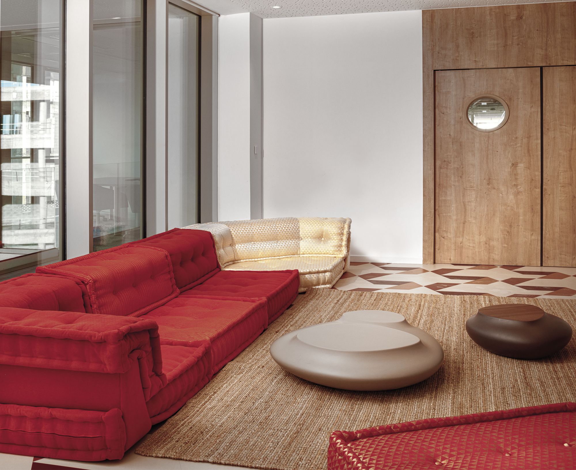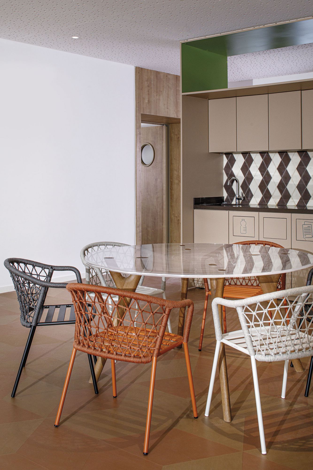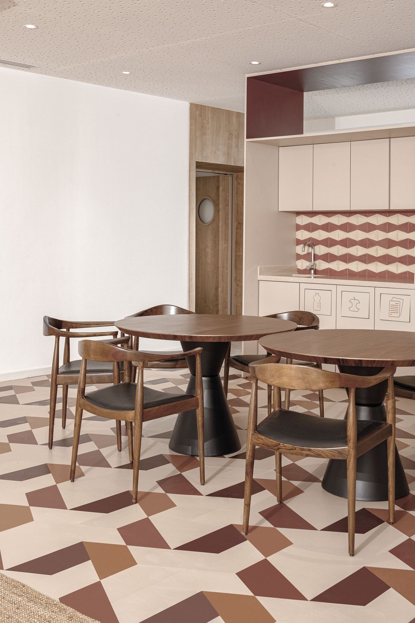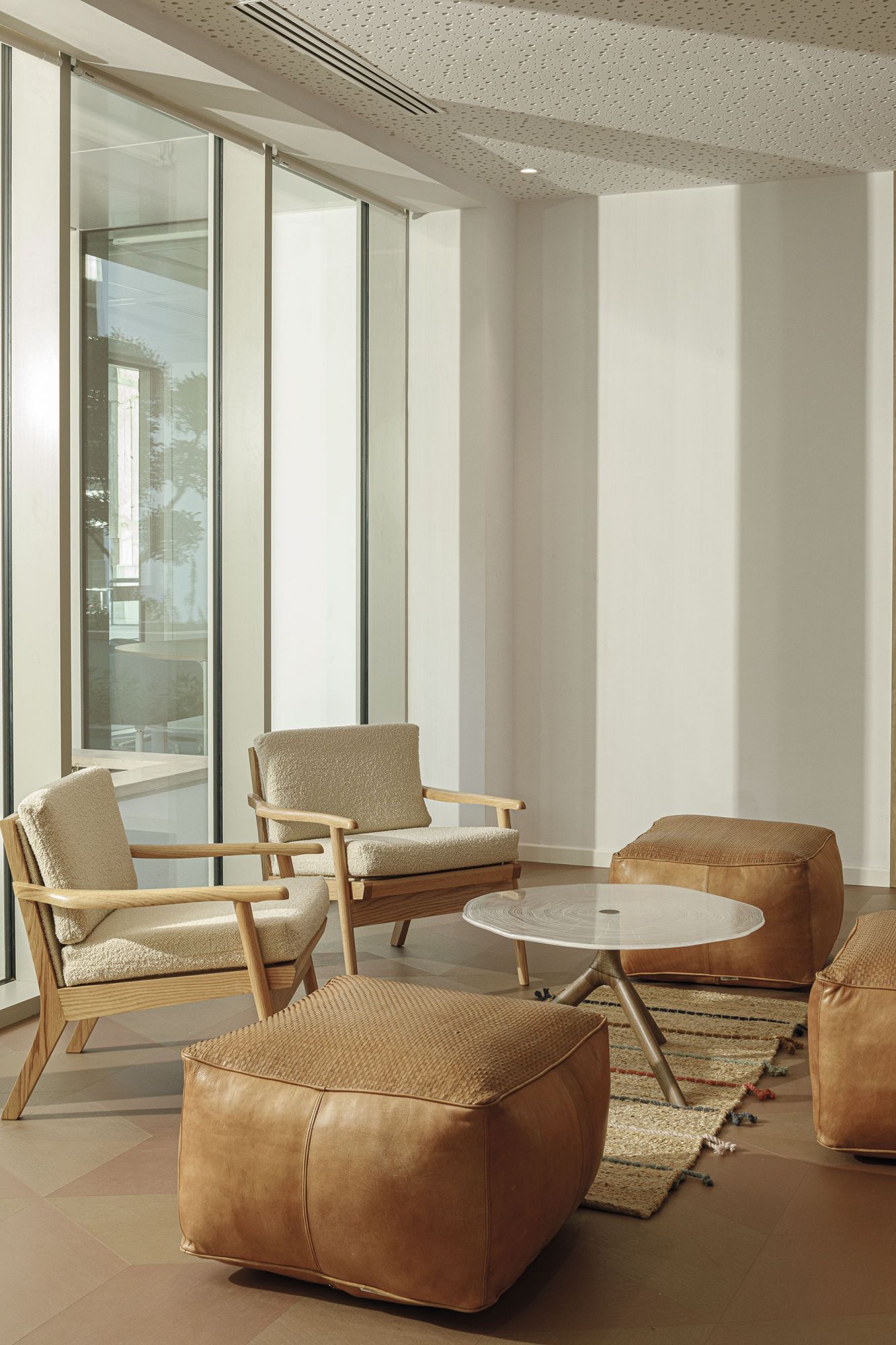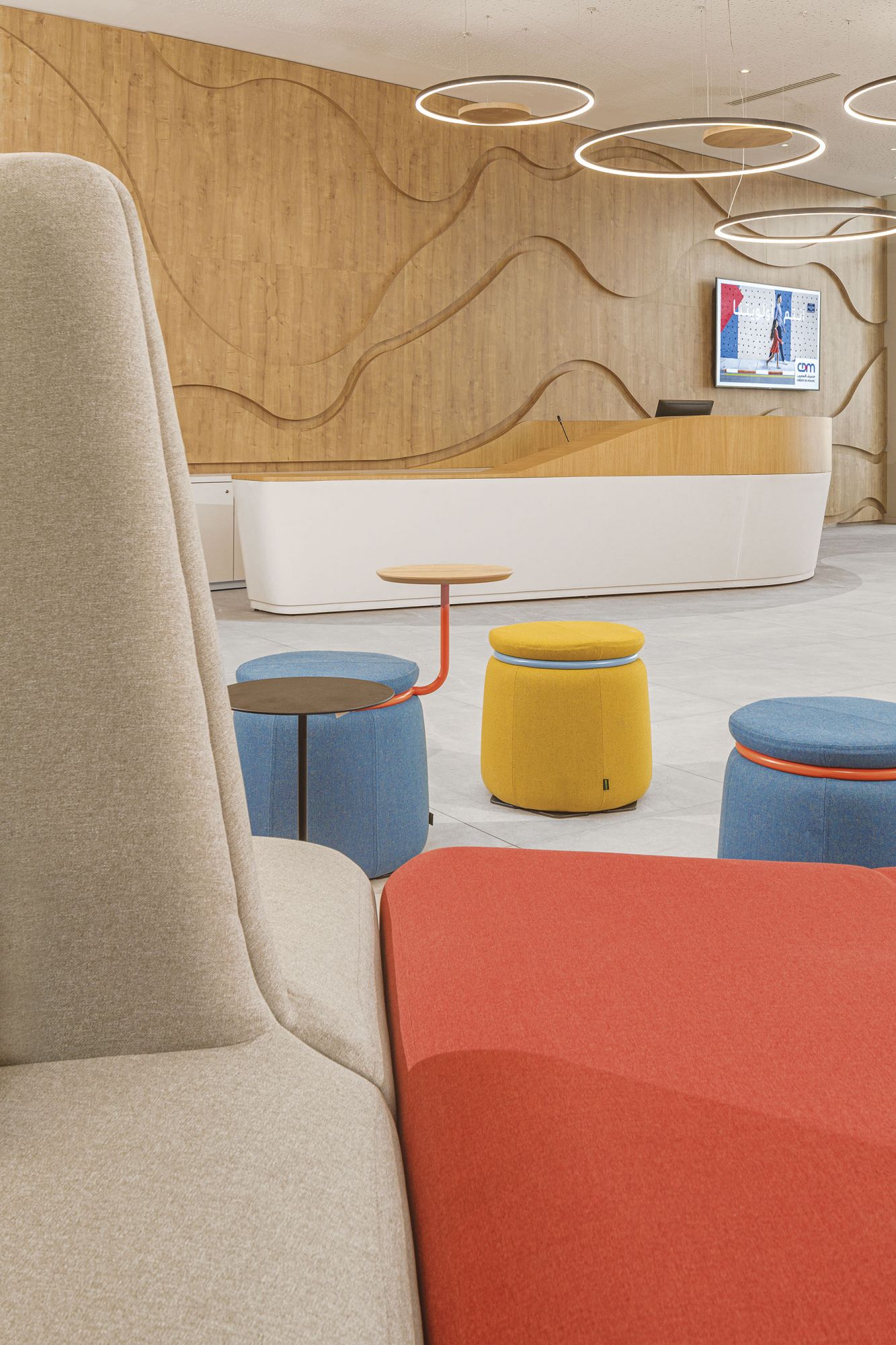 Le lounge d’étage est un espace central où se croisent plusieurs flux collaborateurs, avec un design personnalisé pour marquer l’étage, avec comme thématique « Paysage et artisanat marocain »