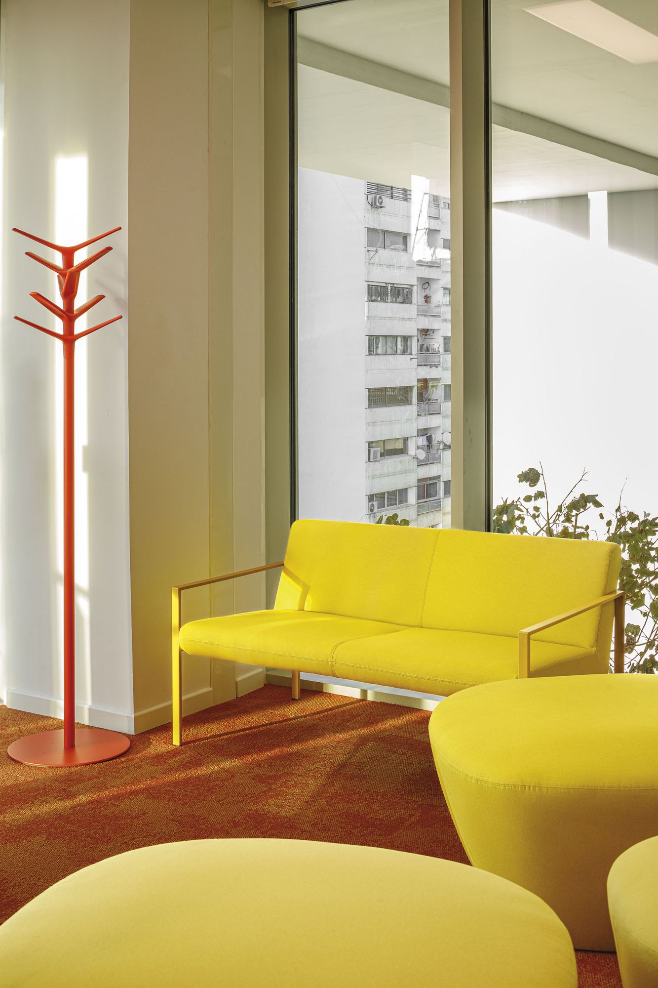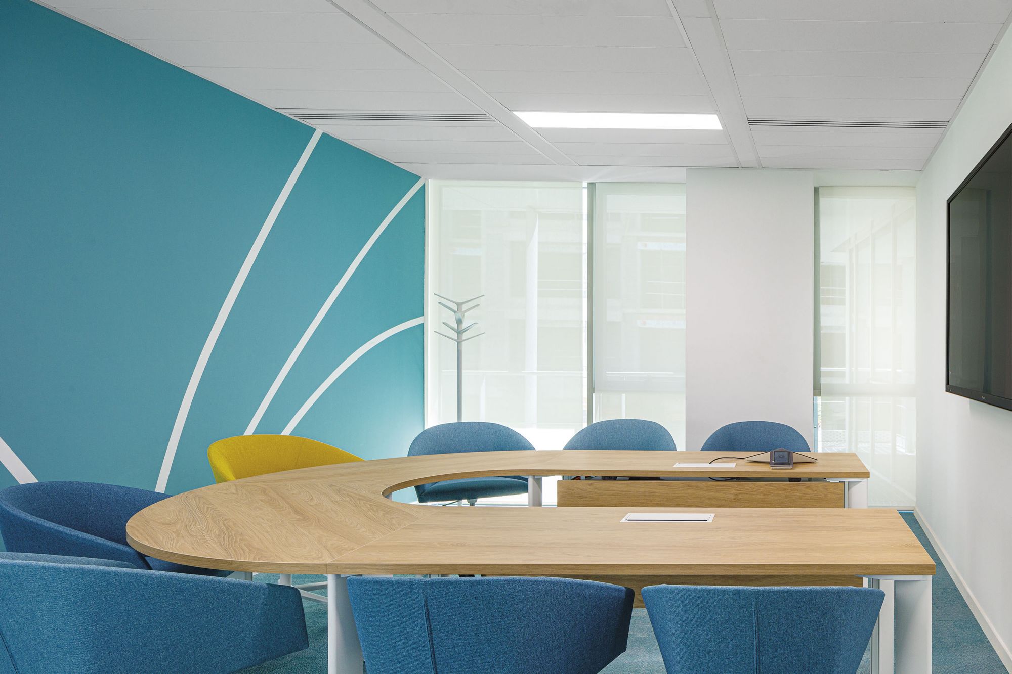 Un fond neutre pour les espaces de travail et espaces informels soulignés par des couleurs d’ambiances utilisés ponctuellement