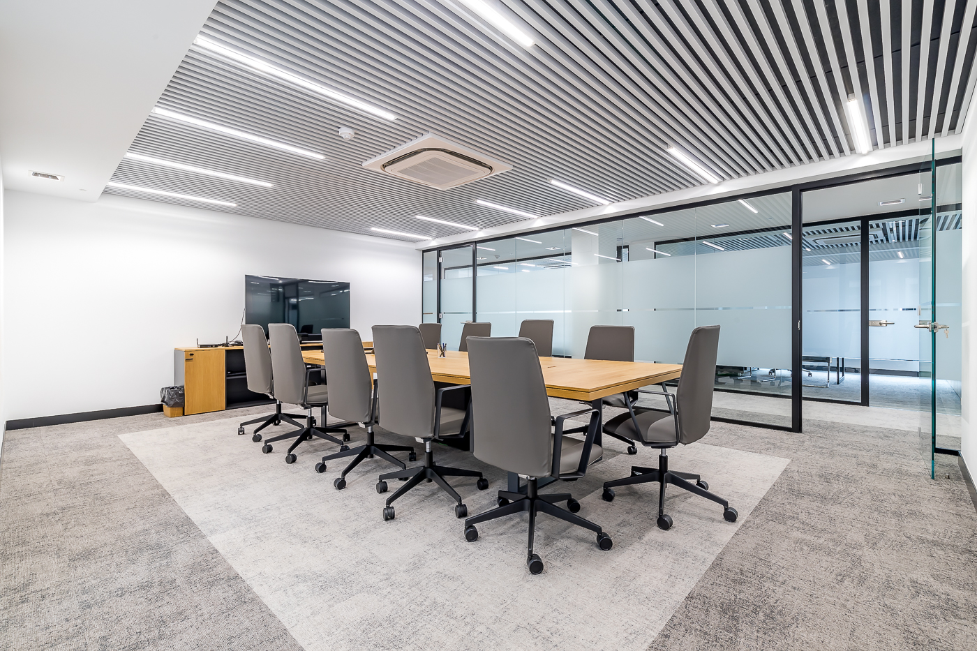 Pour créer une ambiance chaleureuse et élégante, une palette de couleurs a été choisie, combinant des tons tans et gris dans la moquette et le bois naturel, contrastant avec le profil noir des cloisons. Le mobilier de conception classique a ajouté une touche de sophistication, tandis que le plafond moderne à lamelles a non seulement apporté un aspect contemporain, mais aussi un éclairage contrôlé par le matériel, ce qui a permis d'optimiser la consommation d'énergie.Des capteurs individuels intégrés assurent une plus grande praticité et un meilleur confort pour tous les occupants.